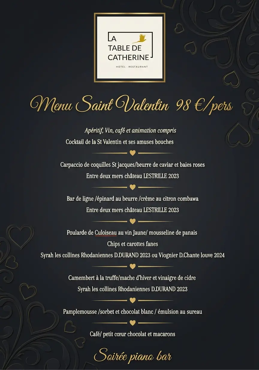 Notre restaurant gastronomique, La Table de Catherine, vous invite à un voyage culinaire exceptionnel. Sous la direction de notre chef renommée Catherine Coiffard, savourez des plats raffinés inspirés des produits locaux et des saisons, dans une atmosphère à la fois chaleureuse et élégante.
